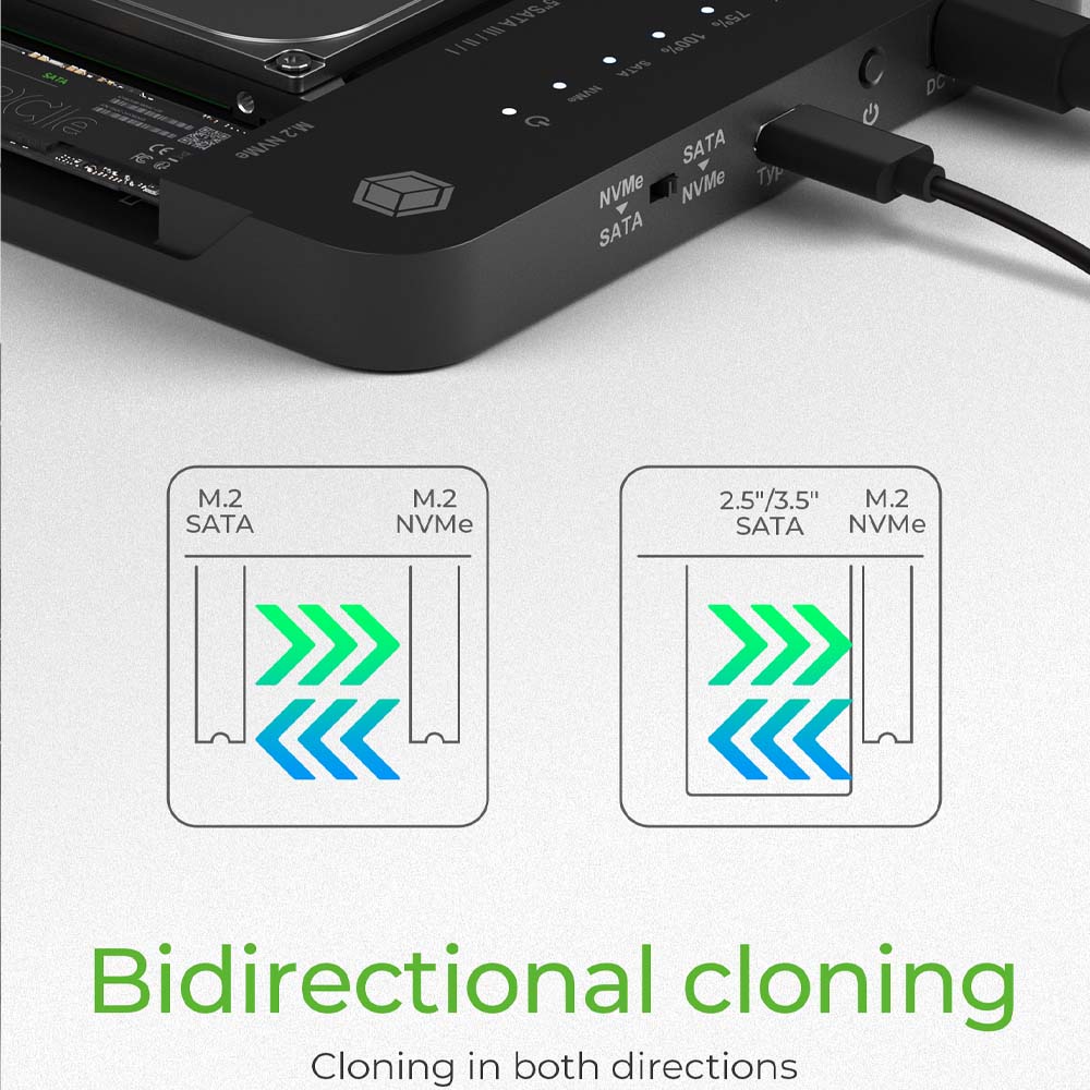 Απλή Αντιγραφή Τα πάντα με Ένα Κουμπί: Από SATA σε PCIe NVMe ή το αντίστροφο, 2.5"/3.5" σκληροί δίσκοι σε M.2 ή και το αντίστροφο, ή ακόμα και M.2 σε M.2 – όλα γίνονται πολύ εύκολα και χωρίς εργαλεία! Απλώς επιλέξτε την κατεύθυνση της αντιγραφής με έναν διακόπτη και οι δίσκοι τοποθετούνται και αντιγράφονται χωρίς την ανάγκη ειδικών εργαλείων.