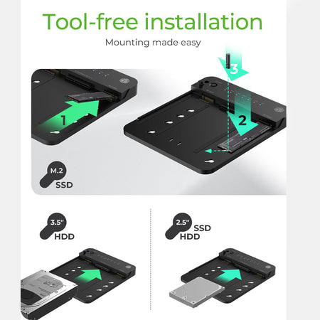 Εύκολη Τοποθέτηση: Ζήστε μια νέα εποχή εγκατάστασης σκληρών δίσκων με τον σχεδιασμό χωρίς εργαλεία, επιτρέποντας την γρήγορη και εύκολη τοποθέτηση σκληρών δίσκων 2.5", 3.5" HDD ή M.2 SSD. Απλά συνδέστε τον δίσκο στη θύρα και απολαύστε την ομαλή διαδικασία αντιγραφής.