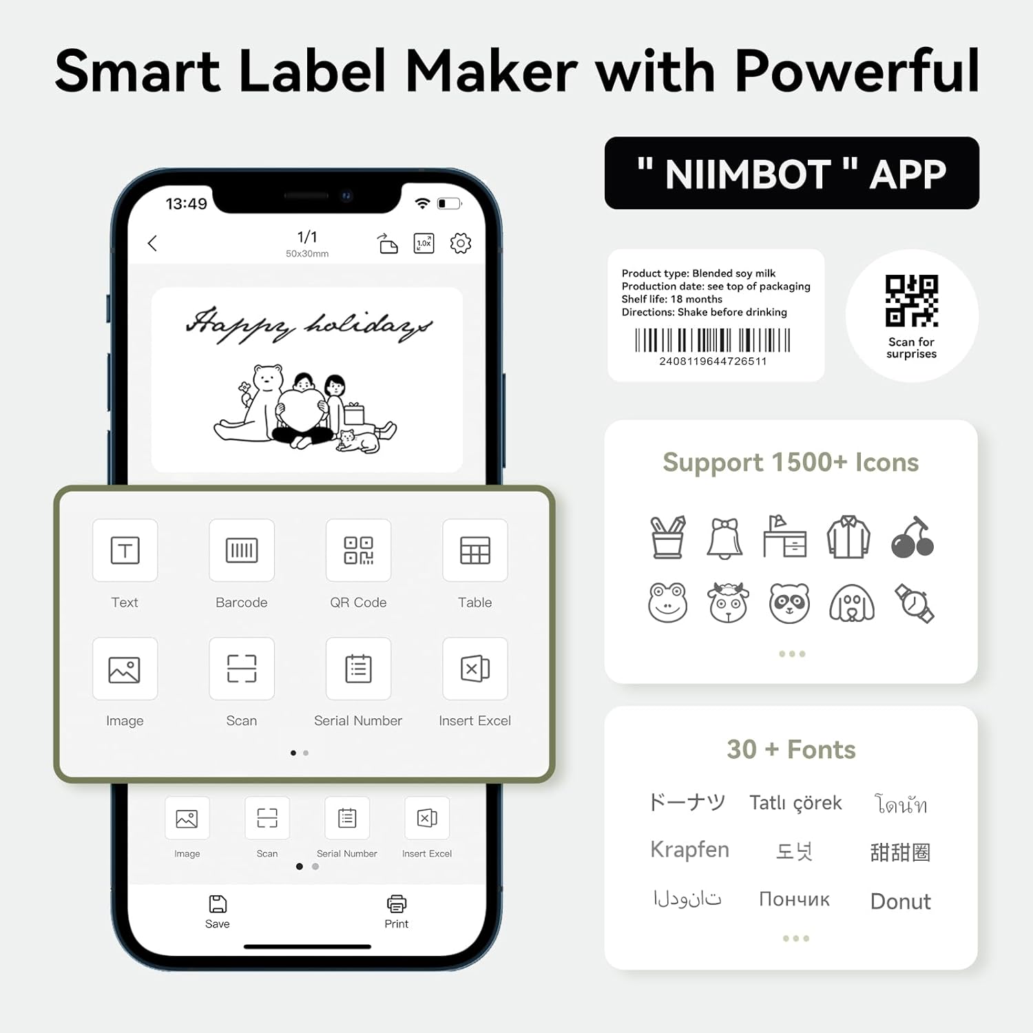 • Εύκολη Χρήση: Ο εκτυπωτής ετικετών B1 Bluetooth είναι συμβατός με iOS, Android και PC. Σημείωση: Δεν είναι συμβατός με iPad. Η δωρεάν εφαρμογή προσφέρει περισσότερες από 30 γραμματοσειρές/γλώσσες, 100+ περιθώρια και 1500+ σύμβολα. Απλά κατεβάστε την εφαρμογή, επιλέξτε και συνδέστε το μοντέλο B1, και ξεκινήστε την εκτύπωση.