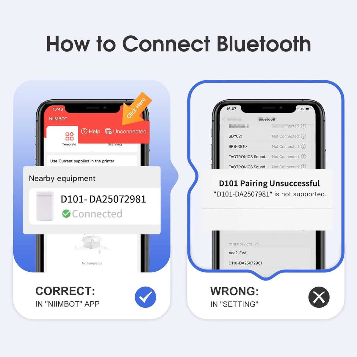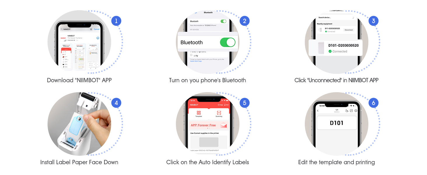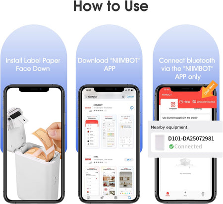• Εύκολος στη Χρήση: Η συσκευή δεν είναι συμβατή με iPad. Για εκτύπωση, εγκαταστήστε την εφαρμογή NIIMBOT από το App Store ή το Google Play, ενεργοποιήστε τον εκτυπωτή D101 και ανοίξτε τη σύνδεση Bluetooth. Επιλέξτε και συνδέστε το μοντέλο D101 στην εφαρμογή NIIMBOT και είστε έτοιμοι να εκτυπώσετε. Ο εκτυπωτής είναι συμβατός με συσκευές Android και iOS.