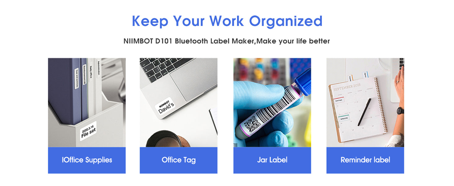 • Ετικετογράφος Χωρίς Μελάνι: Δεν χρειάζεται πια να αγοράζετε μελάνι ή ταινίες άνθρακα! Ο ασύρματος ετικετογράφος NIIMBOT D101 χρησιμοποιεί τεχνολογία θερμικής εκτύπωσης και είναι συμβατός με ετικέτες D11/D110 12-15mm. Υποστηρίζει ετικέτες κενών και διαφανών, με αντοχή στο νερό, την τριβή και το λάδι, ισχυρή πρόσφυση και χωρίς BPA.