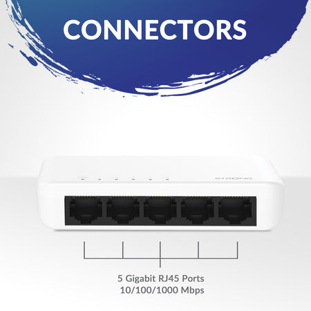 Το switch της STRONG σας επιτρέπει να επεκτείνετε το ενσύρματο δίκτυο σας με 5x θύρες δικτύου που προσφέρουν ταχύτητες έως 1000Mbps.
