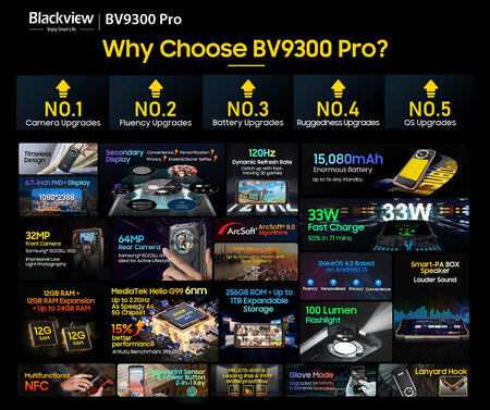 Το Blackview BV9300 Pro είναι ένα smartphone με οθόνη 6,7 ιντσών, οκταπύρηνο CPU MediaTek Helio G99, 12 GB RAM, 256 GB ROM και επεκτάσιμο χώρο αποθήκευσης έως και 1 TB. Διαθέτει μπροστινή κάμερα 32MP και πίσω κάμερα 64MP. Το τηλέφωνο διαθέτει γρήγορη φόρτιση 13 W και μπαταρία 15.080 mAh. Διαθέτει ενσωματωμένο ηχείο και έχει στιβαρή βαθμολογία IP68 & IP69K. Υποστηρίζει διπλές ζώνες 4G VoLTE, Wi-Fi και διπλές ζώνες 4G.