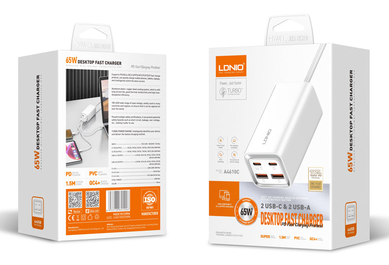 LDNIO σταθμός φόρτισης A4610C, 2x USB-C & 2x USB, 65W, PD/QC, λευκός