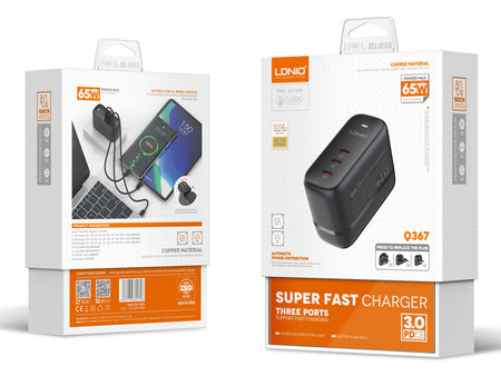 LDNIO φορτιστής τοίχου Q367 με καλώδιο USB-C, 3x USB-C, 65W, GaN, μαύρος