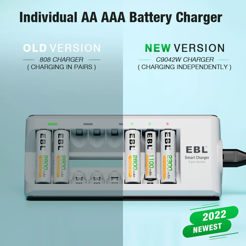 The C9042W battery charger can charge all brands 2/4/6/8 Ni-MH Ni-CD AA rechargeable batteries and AAA battery.