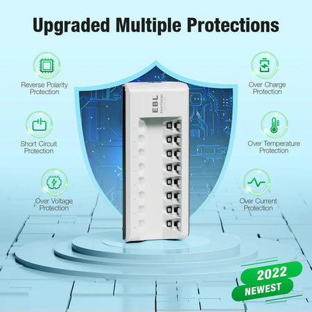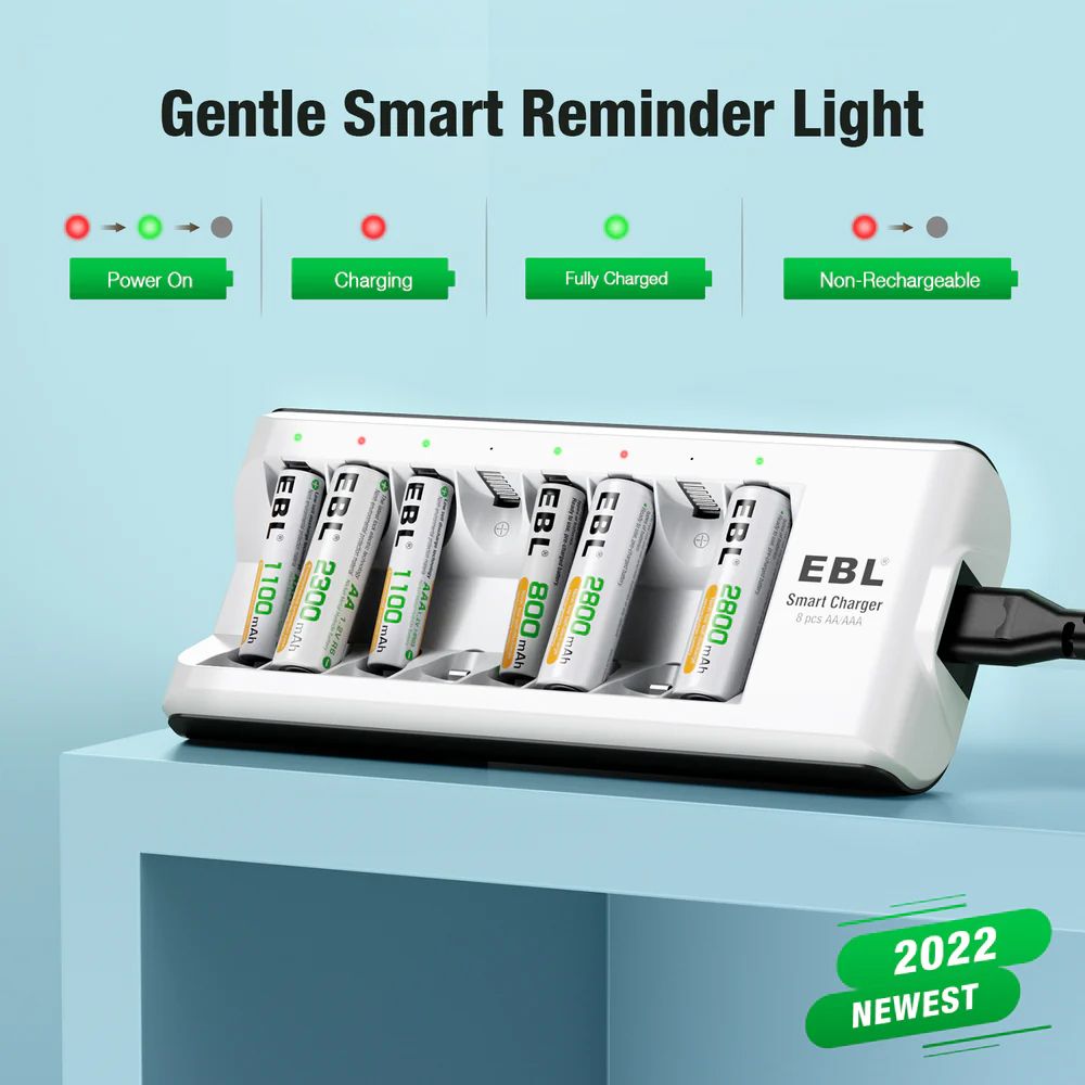 8-Bay battery charger with smart LED to show its charging progress: RED - charging; GREEN - fully charged. Red LED Flash: a bad battery or non-rechargeable battery.