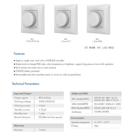 GloboStar® 71443 K1 Mi-BOXER Ασύρματο Επιτοίχιο Χειριστήριο Dimmer RF 2.4Ghz για όλα τα Μονόχρωμα Mi-BOXER Controller DC 3V 1 x CR2032 - IP20 Λευκό Μ8.5 x Π8.5 x Υ2.5cm - 5 Years Warranty
