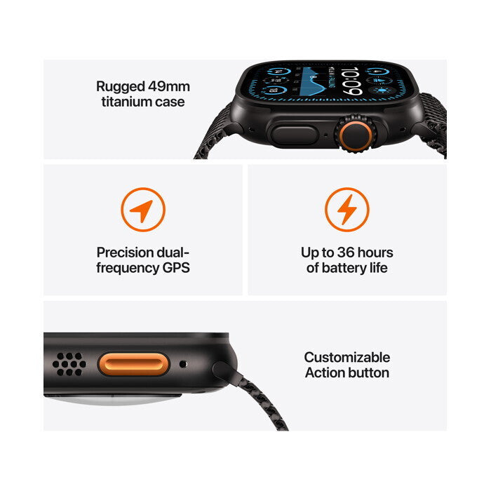 Γνωρίστε το απόλυτο ρολόι για σπορ και περιπέτειες. Προηγμένες δυνατότητες για δρομείς, ποδηλάτες, κολυμβητές, ορειβάτες, δύτες και άλλα. Ανθεκτική κάσα τιτανίου, τώρα διαθέσιμη σε ματ μαύρο. Πολύ φωτεινή Always-On Retina οθόνη. Απίστευτα ακριβές GPS διπλής συχνότητας. Ισχυρά χαρακτηριστικά υγείας, ασφάλειας και συνδεσιμότητας. Και μέχρι 36 ώρες διάρκεια μπαταρίας για κανονική χρήση και 72 ώρες σε Λειτουργία Εξοικονόμησης Ενέργειας.