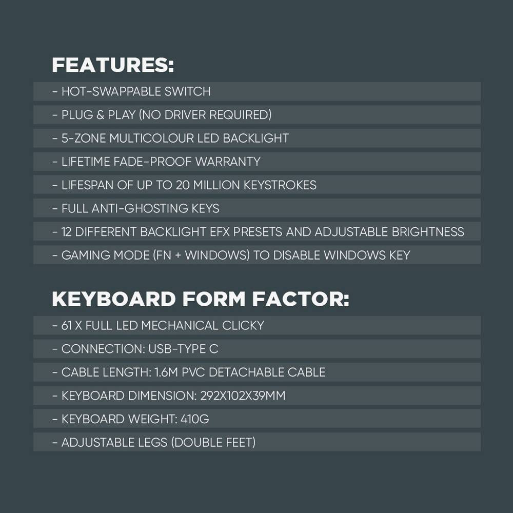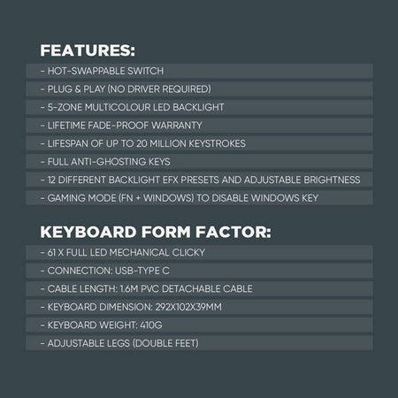 Αναβαθμίστε την εμπειρία σας στο gaming και την πληκτρολόγηση με το Armaggeddon MKA-1C Nex, ένα compact 61 πλήκτρων μηχανικό πληκτρολόγιο που συνδυάζει κορυφαία απόδοση, ανθεκτικότητα και στυλ. Ιδανικό για gamers και δημιουργούς που αναζητούν ακρίβεια, ταχύτητα και δυνατότητα πλήρους προσαρμογής.