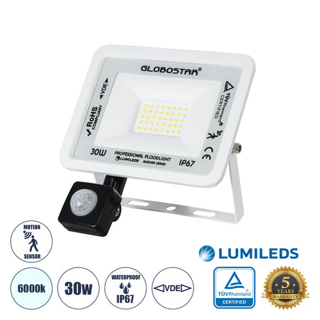 GLOBOSTAR® AURORA 64440 Προβολέας με Ανιχνευτή PIR / Αισθητήρα Κίνησης LED 30W 3750lm 120° AC 220-240V Αδιάβροχο IP67 Ψυχρό Λευκό 6000K - Lumileds SMD Chip - TÜV Rheinland Certified - Λευκό Ματ - Μ16 x Π5 x Υ17.5cm - 3 Χρόνια Εγγύηση