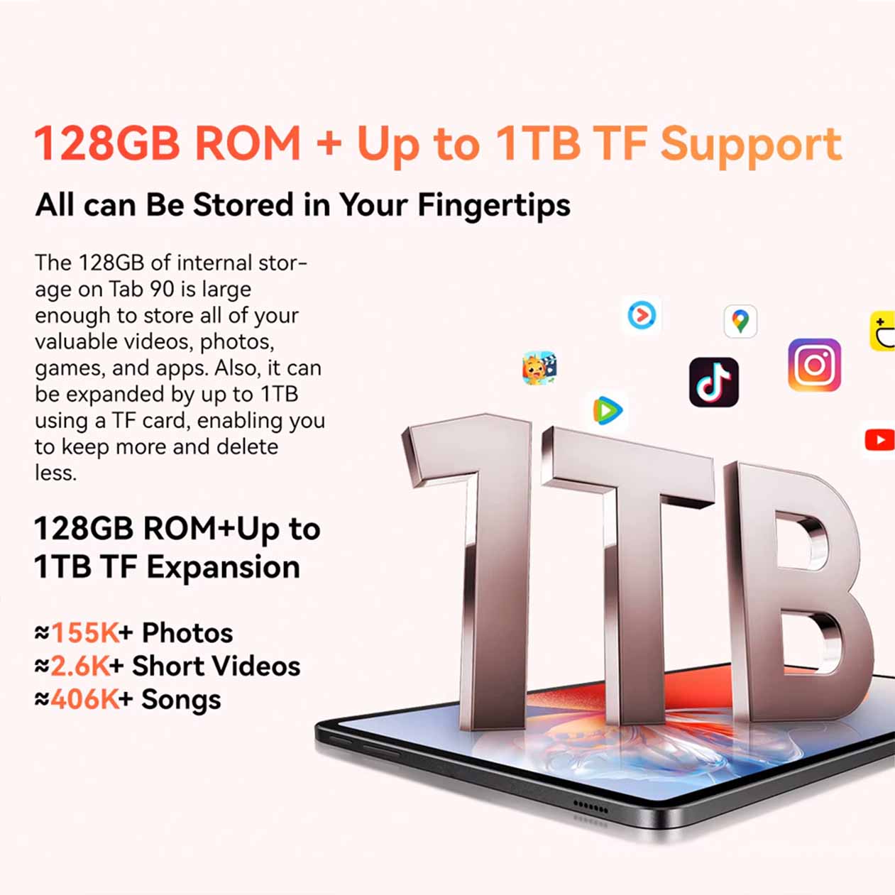 128GB ROM, το Tab 90 σας προσφέρει άφθονο χώρο για να αποθηκεύσετε φωτογραφίες, βίντεο, και εφαρμογές. Επιπλέον, μπορείτε να επεκτείνετε την αποθηκευτική χωρητικότητα με κάρτα microSD έως