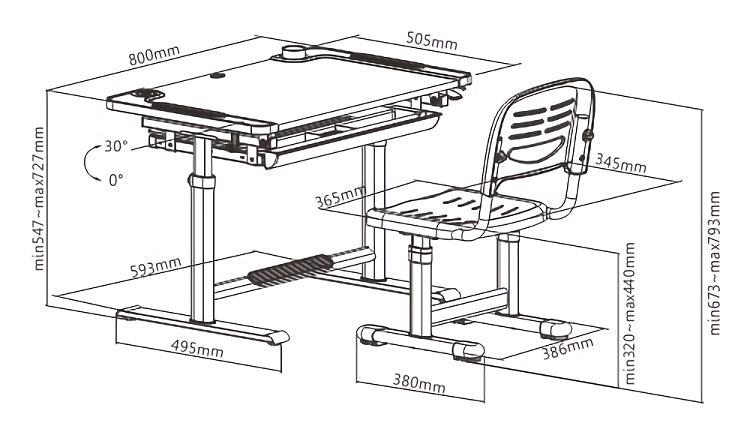 Το σετ παιδικού γραφείου B301, αποτελείται από ένα πλήρως ρυθμιζόμενο, εργονομικό γραφείο και ένα, επίσης ρυθμιζόμενο, κάθισμα, προσφέροντας έναν ιδανικό χώρο εργασίας στο παιδί, καθώς μεγαλώνει. Το γραφείο έχει ρυθμιζόμενο ύψος και γωνία κλίση της επιφάνειας εργασίας, μέσω ενός ειδικού μηχανισμού, ο οποίος είναι εύκολος στην χρήση, ακόμη και από το παιδί. Η ρύθμιση της κλίσης της επιφάνειας είναι πολύ σημαντική, καθώς προσφέρει έναν εργονομικό χώρο εργασίας και αποτρέπει τις αντανακλάσεις, ώστε να μην κουράζονται τα μάτια. Το γραφείο διαθέτει ένα μεγάλο και πολύ πρακτικό συρτάρι με θήκες, υποπόδιο και κρεμάστρα σακιδίου. Το κάθισμα ρυθμίζεται καθ' ύψος και είναι σταθερό, άνετο, ελαφρύ και ανθεκτικό.