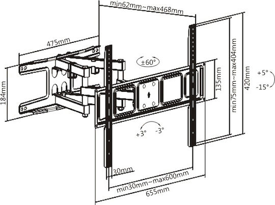 Επιτρέπει κλίση +5°~ -15° και περιστροφή +60°~ -60°, γεγονός που προσδίδει μέγαλη ευελιξία θέασης από κάθε γωνιά του δωματίου.