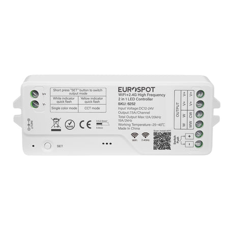 The EuroSpot Led High Frequency Controller 2in1 Tuya WiFi+ 2.4RF+ Push Dim is a versatile and reliable solution designed for advanced LED lighting control. This high frequency LED controller supports multiple control methods, including WiFi connectivity via Tuya, 2.4GHz RF remote control, and push dimming, offering flexible and convenient operation for various lighting applications. Engineered to operate efficiently with LED systems, the controller ensures stable performance with minimal flicker, enhancing the longevity and quality of your LED installations. It is compatible with a wide voltage range, making it suitable for different power setups. The integration of high frequency technology guarantees smooth dimming and precise brightness adjustment, which is essential for both residential and commercial environments. Ideal for professional lighting projects, the EuroSpot controller supports seamless integration with smart home systems through the Tuya platform, enabling remote management and automation. Its robust design and advanced features make it a dependable choice for users seeking high performance and ease of use in LED lighting control.