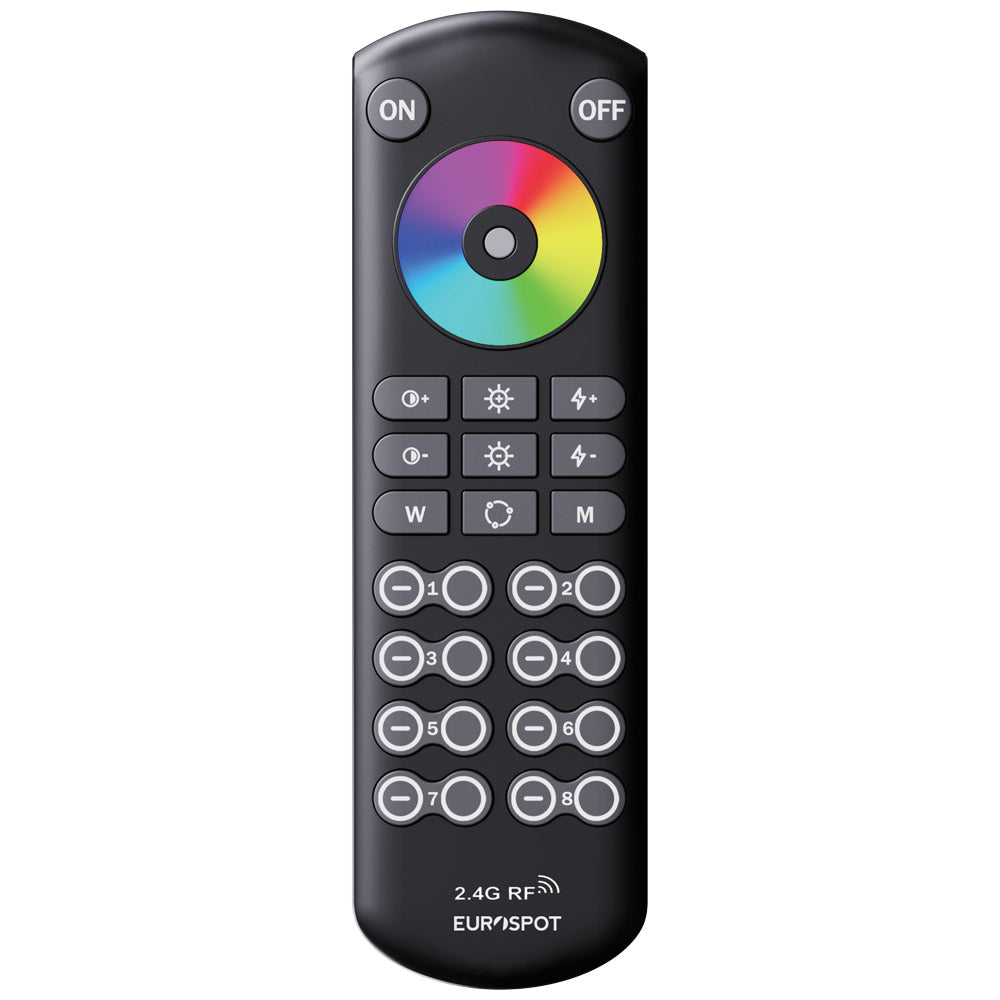 Το EuroSpot RF 2.4GHz Μαύρο Τηλεχειριστήριο 8-Ζωνών για RGB+CCT, υιοθετεί την ευρέως διαδεδομένη συχνότητα των 2.4GHz με διαμόρφωση GFSK. Κύρια χαρακτηριστικά του είναι η χαμηλή κατανάλωση ενέργειας, ισχυρή αντί- παρεμβολικότητα με γρήγορο επικοινωνιακό ρυθμό και εμβέλεια μέχρι τα 150μ. Συνεργαζόμενο με τον αντίστοιχο EuroSpot Controller μπορείτε να επιλέξετε το χρώμα του φωτισμού σας καθώς επίσης και να ρυθμίσετε τη θερμοκρασία, κορεσμό και φωτεινότητα του φωτισμού σας.