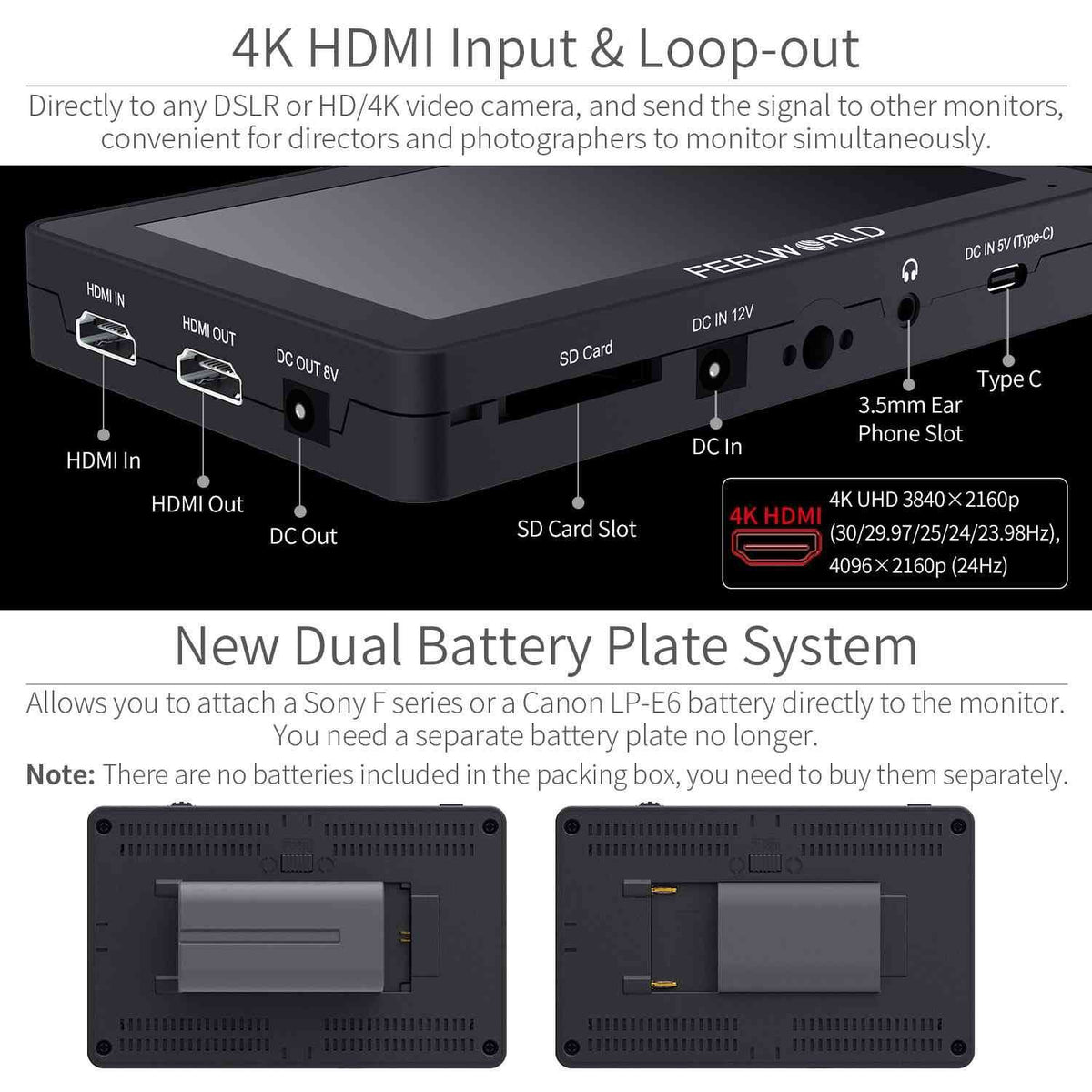 The FeelWorld F6 Plus 6" 4K HDMI Monitor features a touchscreen display with a 1920 x 1080 resolution and a brightness of 500 cd/m². It supports HDMI input signals up to DCI 4K24 and UHD 4K30, and it provides an HDMI output for connecting to wireless transmitters, larger on-set monitors, and other devices. LUTs in .cube format are supported via an SD card slot to view S-Log2, S-Log3, V-Log, and Log-C profiles in Rec. 709 color space.
