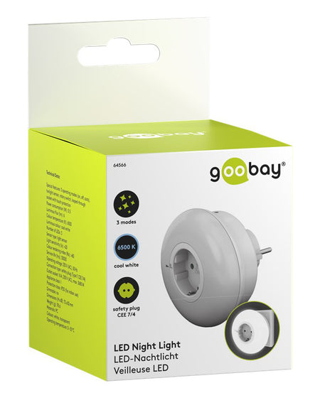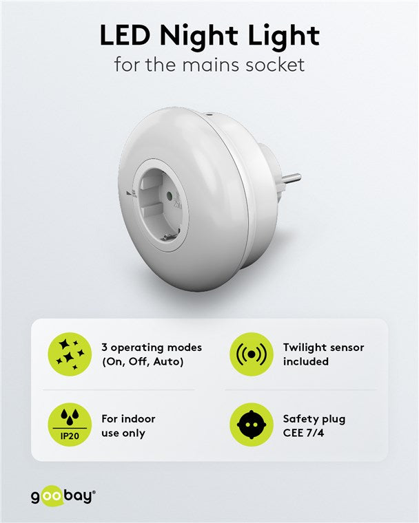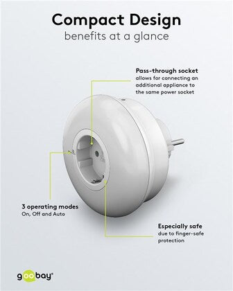 Φωτιστικό νυκτός LED της Goobay με passthrough πρίζα schuko για την αξιοποίηση της πρίζας του σπιτιού. Εξοπλίζεται με αισθητήρα φωτός για την αυτόματη ενεργοποίηση του φωτιστικού όταν η φωτεινότητα φτάσει σε επίπεδο κάτω από 21 lx.