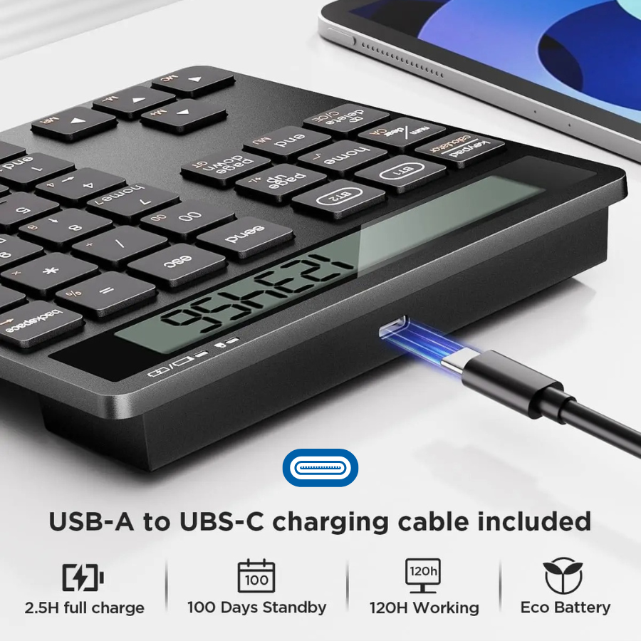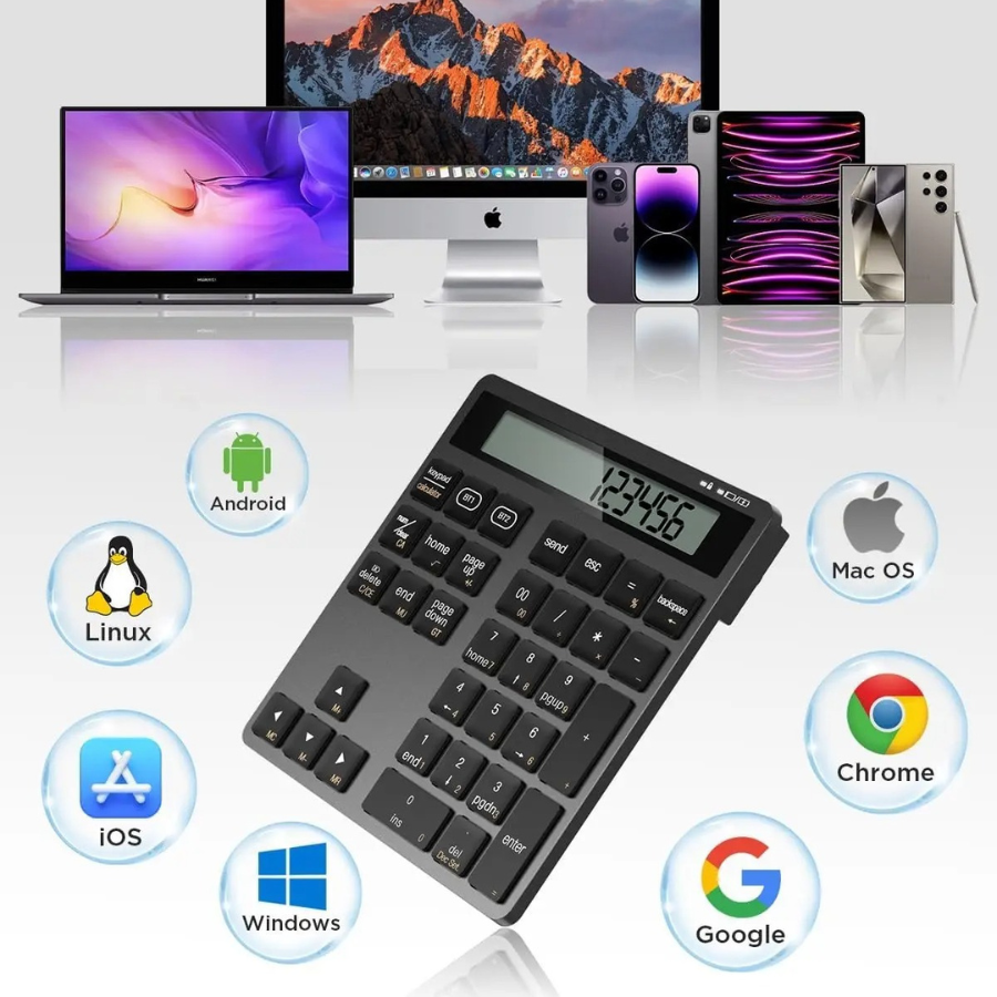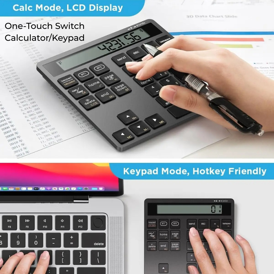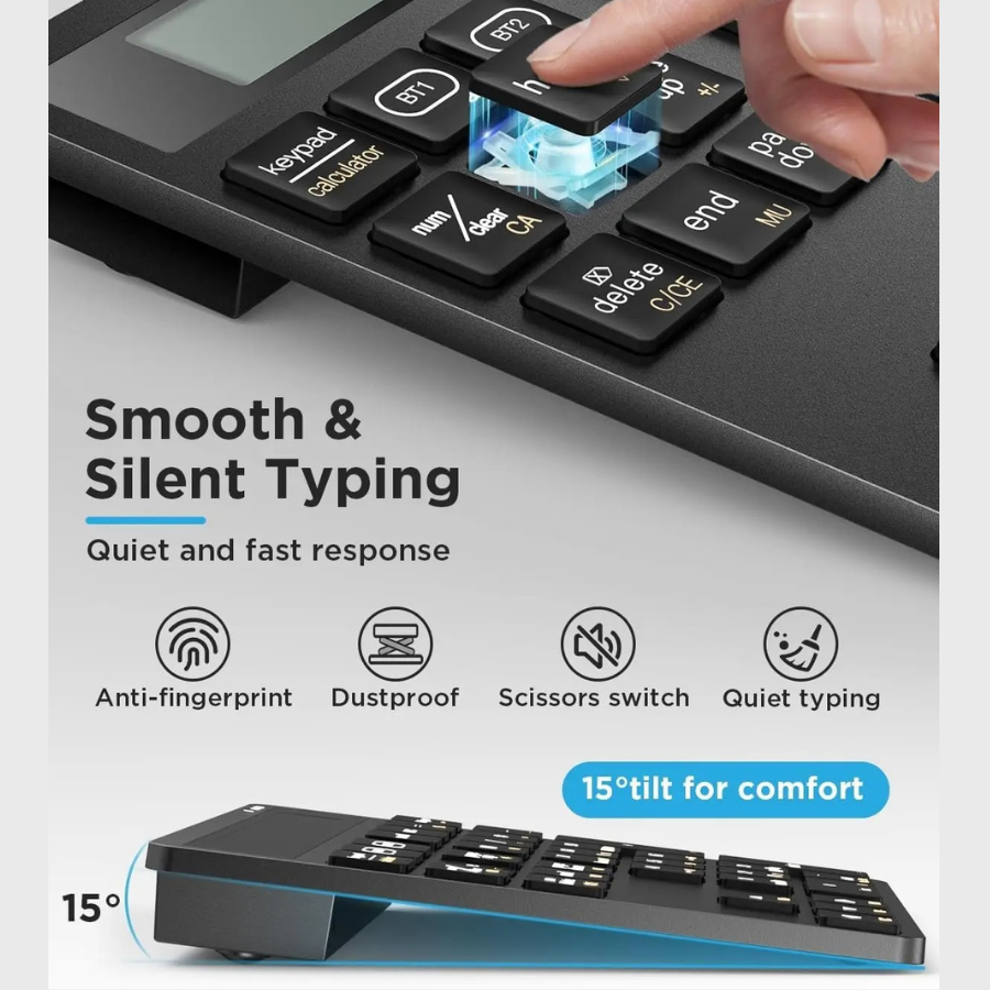 Υποστηρίζει διπλή σύνδεση Bluetooth, επιτρέποντας τη σύνδεση με δύο συσκευές ταυτόχρονα — για εύκολη εναλλαγή μεταξύ laptop, tablet ή smartphone. Χάρη στη διάταξη 34 πλήκτρων με NumLock, ESC, Tab, Delete και συντομεύσεις υπολογιστή, προσφέρει ταχύτητα και ακρίβεια στην εισαγωγή δεδομένων, ιδανική για λογιστικά φύλλα ή επαγγελματικές εφαρμογές.