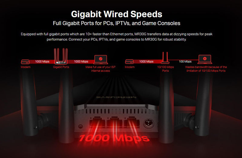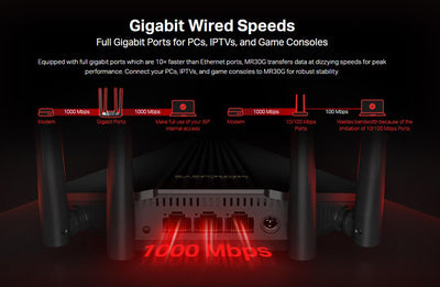 Με ασύρματες ταχύτητες έως 867Mbps στη ζώνη 5GHz και 300Mbps στη ζώνη 2.4GHz, το MR30G σας προσφέρει την ευελιξία δύο αποκλειστικών δικτύων και εξασφαλίζει εκπληκτική ασύρματη απόδοση WiFi.