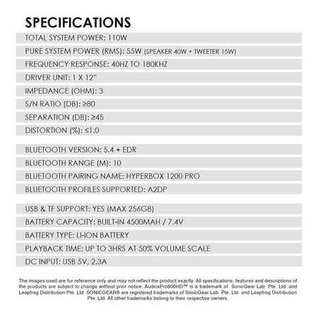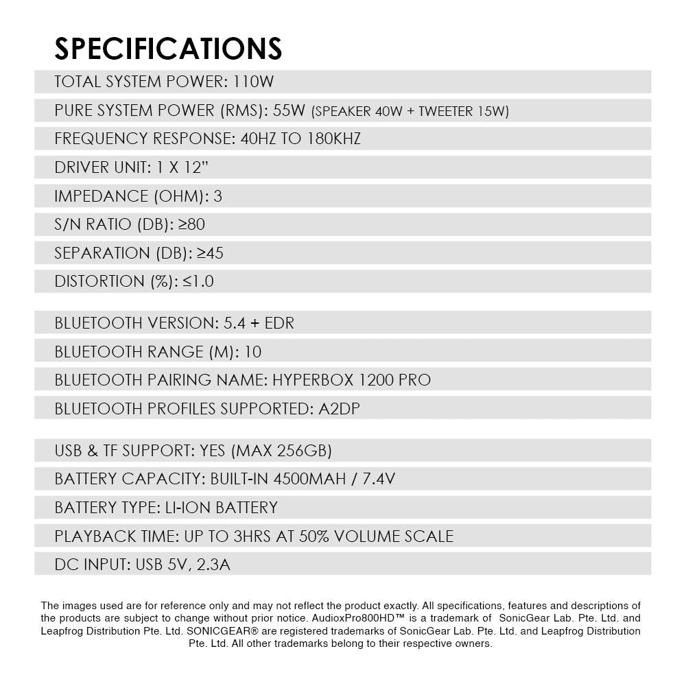 Ισχυρό, φορητό και γεμάτο δυνατότητες — το SonicGear HyperBox 1200 Pro είναι η ιδανική λύση για διασκέδαση και επαγγελματική χρήση. Με δυνατό ήχο, εντυπωσιακό RGB φωτισμό και μεγάλη αυτονομία, είναι ιδανικό για το σπίτι, το karaoke, τις παρουσιάσεις, τα σεμινάρια και κάθε είδους εκδήλωση.