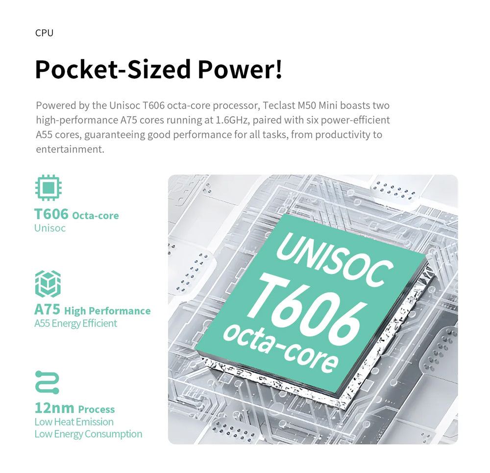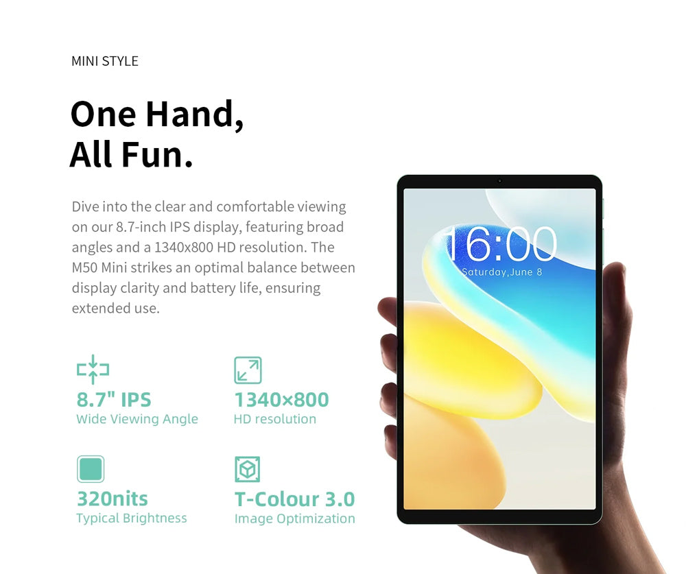 Το tablet M50 Mini της Teclast συνδυάζει εντυπωσιακές επιδόσεις και εκλεπτυσμένο σχεδιασμό. Με οθόνη 8.7", ευέλικτο σύστημα λειτουργικού Android 15 και ισχυρό οκταπύρηνο επεξεργαστή, το M50 Mini προσφέρει υψηλή απόδοση, για απρόσκοπτη περιήγηση στο διαδίκτυο, παιχνίδια, πολυμέσα και πολλά άλλα.