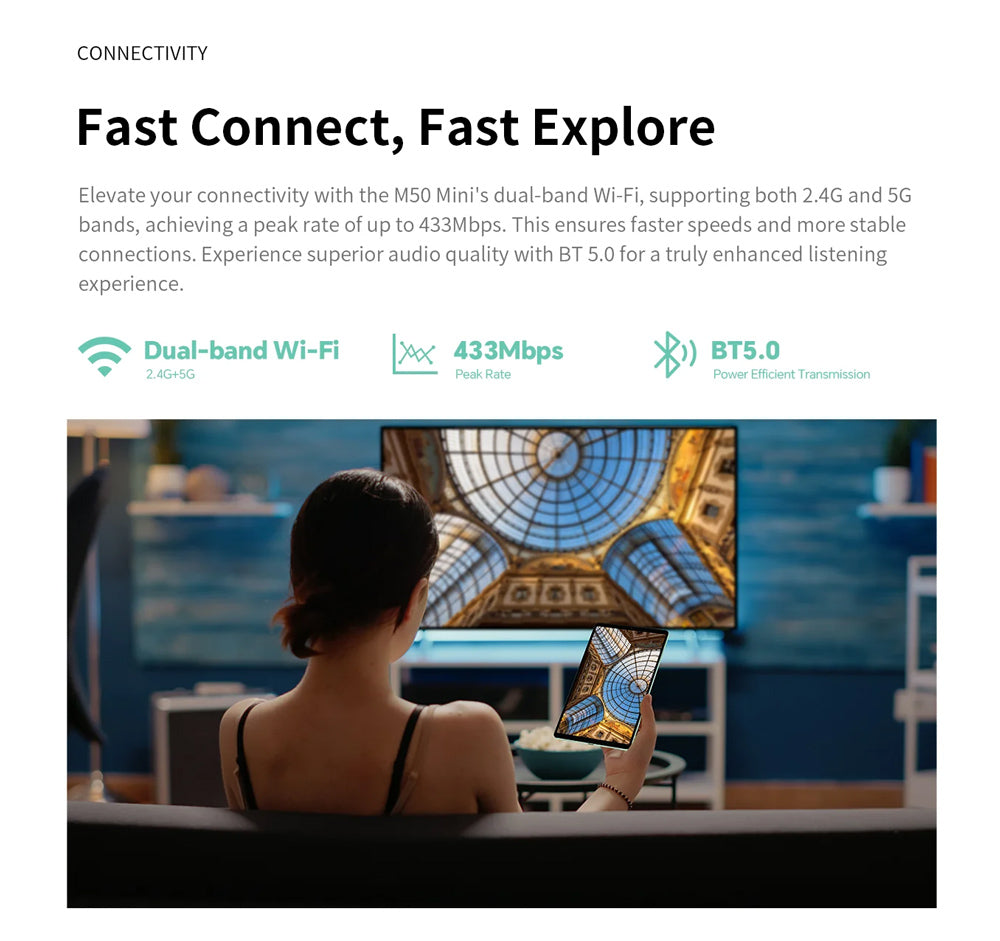 Με ελαφρύ και λεπτό μεταλλικό σώμα, το tablet M50 Mini είναι άνετο στη χρήση και εύκολο να μεταφέρεται παντού.