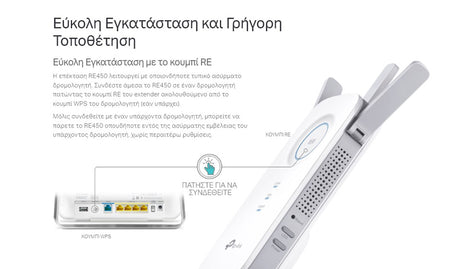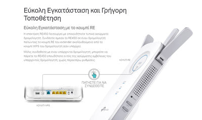 Έχετε κουραστεί από νεκρές ζώνες Wi-Fi στο σπίτι σας; Το RE450 Range Extender συνδέεται ασύρματα με το router Wi-Fi, ενισχύοντας και επεκτείνοντας το σήμα του έως και 1.115 τετραγωνικά μέτρα. Με ταχύτητες έως 450Mbps στα 2,4GHz και 1300Mbps στα 5GHz, αντικαταστήστε τις νεκρές ζώνες με ισχυρό, γρήγορο Wi-Fi σε κάθε δωμάτιο.