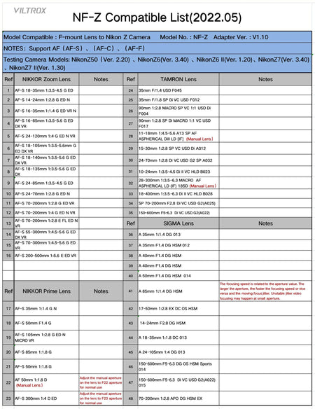 The Nikon F-Mount Lens to Z-Mount Camera Adapter from Viltrox expands your lens options by supporting the wide range of F-mount lenses available from Nikon. The adapter lets you attach F-mount lenses to Z-mount cameras such as the Nikon Z7 II. Featuring a motor-driven iris and a gear box, the adapter supports high speed auto focus. It also supports Exif transmission and VR lens stabilization.