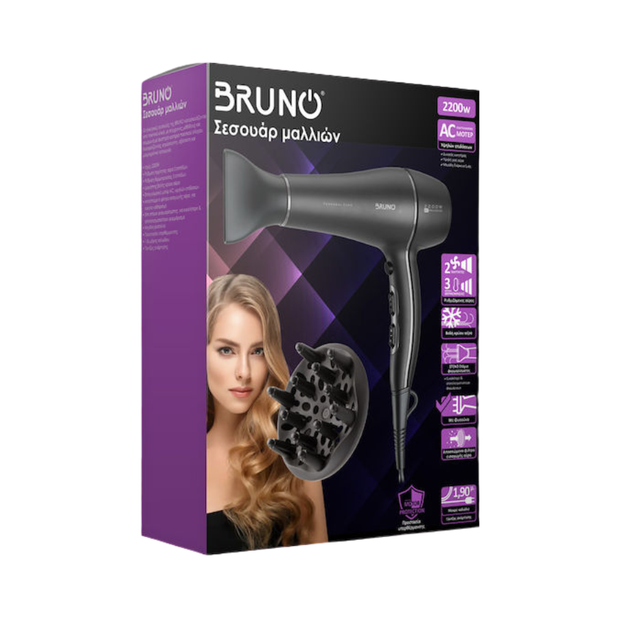 BRUNO σεσουάρ μαλλιών AC BRN-0155, 2200W, με φυσούνα, μαύρο