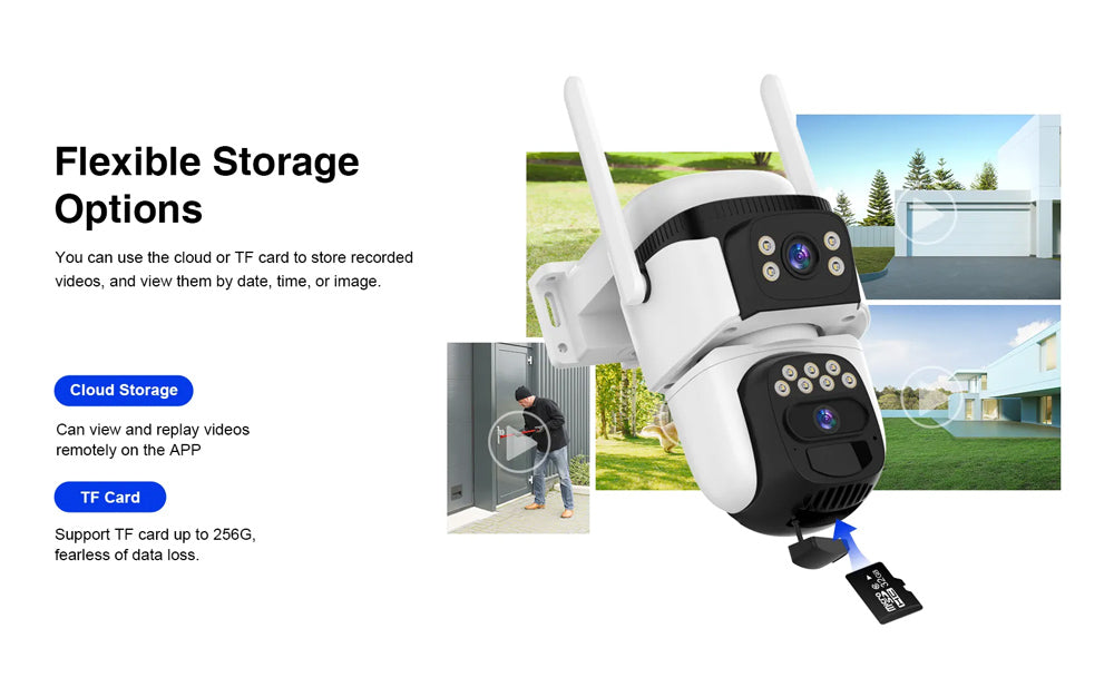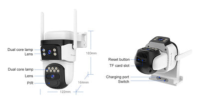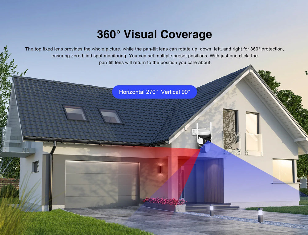 Ενσωματώνει 2 φακούς που επιτρέπουν μεγαλύτερη κάλυψη στον χώρο και υποστηρίζει PTZ λειτουργία που σας επιτρέπει την οριζόντια και κάθετη μετακίνηση της κάμερας μέσω της εφαρμογής.