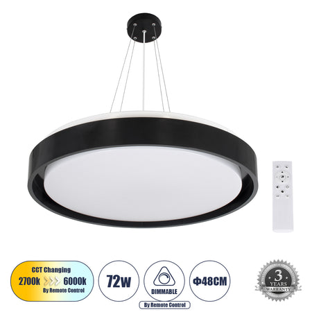 GLOBOSTAR® BARCHETTA 61046 Μοντέρνο Κρεμαστό Φωτιστικό Οροφής LED 72W 8306lm 120° AC 220-240V IP20 Ρυθμιζόμενο Λευκό CCT με Χειριστήριο από 2700K έως 6000K Dimmable - Lumileds SMD Chip - Μαύρο Ματ - Μ48 x Π48 x Υ8.2cm - 3 Χρόνια Εγγύηση