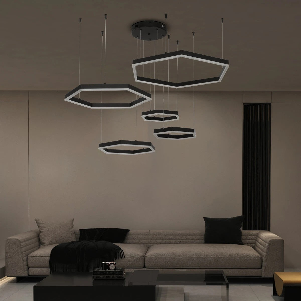 kelvo® LEXAGON 61397 Μοντέρνο Κρεμαστό Φωτιστικό Οροφής LED 120W 12000lm 200° AC 220-240V IP20 Ρυθμιζόμενο Λευκό CCT με Χειριστήριο από 2700K έως 6000K Dimmable - Lumileds SMD Chip - Μαύρο - Μ110 x Π90 x Υ110cm - 3 Χρόνια Εγγύηση