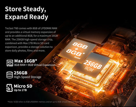 Η ενσωματωμένη μνήμη 8GB (+8GB virtual) RAM και 256GB ROM παρέχει αρκετό χώρο για να εγκαταστήσετε παιχνίδια, ταινίες και τραγούδια, ενώ, προσφέρει την δυνατότητα να επεκτείνετε τον χώρο αποθήκευσης του tablet μέσω κάρτας micro SD (δεν συμπεριλαμβάνεται).
