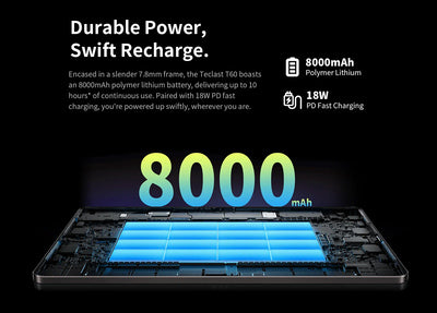 Η μπαταρία μεγάλης χωρητικότητας 8000mAh προσφέρει μεγάλη αυτονομία που θα σας απαλλάξει από τις συχνές αναζητήσεις τροφοδοσίας.