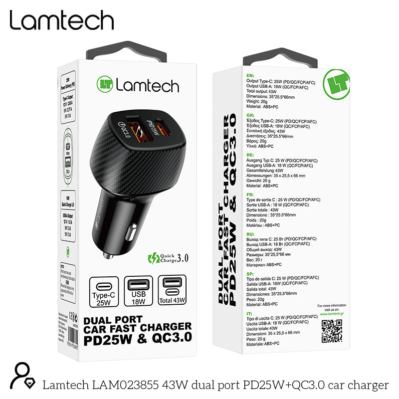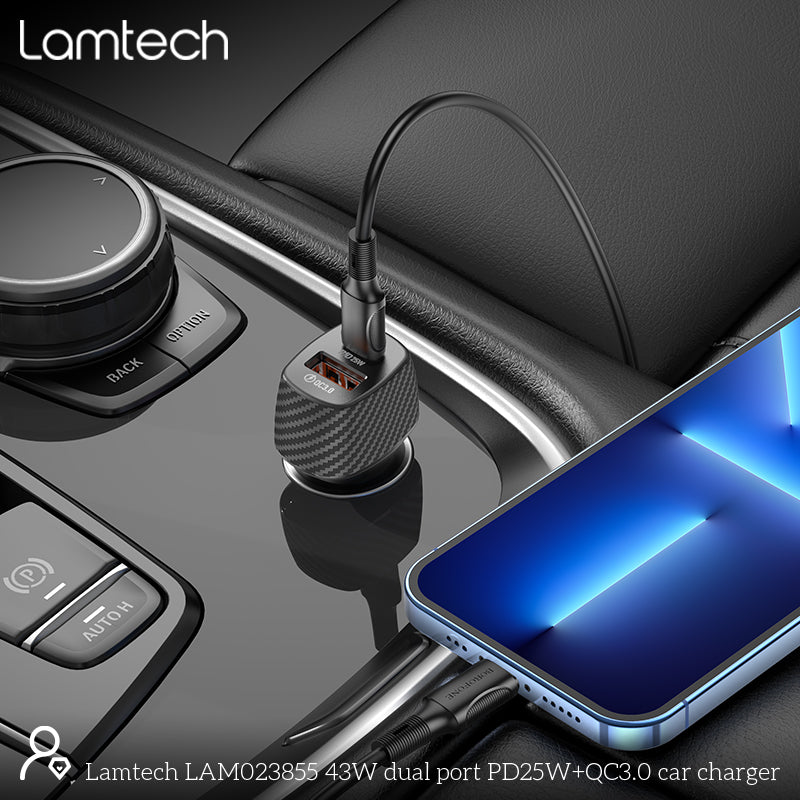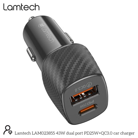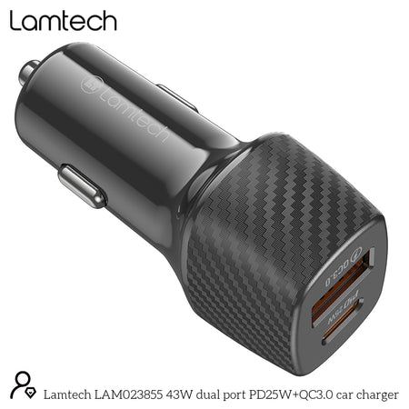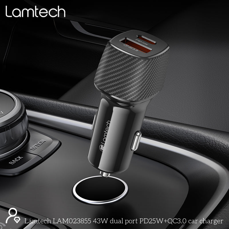 Lamtech Dual Port Car Fast Charger Type C Pd 25 W & Usb 18 W Black
