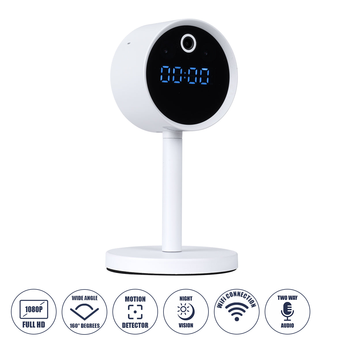 GloboStar® 86006 Rechargeable Table Camera WiFi HD 1080P 160° 1500mAh Two Way Audio Motion Detection & Digital Clock - Επαναφορτιζόμενη Επιτραπέζια Κάμερα WiFi HD 1080P 160° 1500mAh Διπλή Κατέυθυνση Ομιλίας Ανιχνευτή Κίνησης & Ψηφιακό Ρολόι - Λευκό
