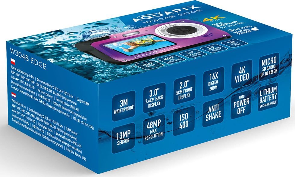 Ανακαλύψτε την AQUAPIX WATERPROOF 4K CAMERA W-3048, την ιδανική κάμερα για τις υποβρύχιες περιπέτειές σας, τις υπαίθριες δραστηριότητες και την καταγραφή εντυπωσιακών στιγμών σε δύσκολες συνθήκες. Με το μοναδικό Μωβ Edge σχέδιο, αυτή η συμπαγής και ανθεκτική κάμερα προσφέρει 4K ανάλυση, καθιστώντας την ιδανική για όποιον επιθυμεί εικόνα υψηλής ποιότητας, είτε είναι στη στεριά είτε υποβρύχια.