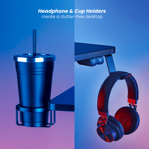 Εντυπωσιακό γραφείο GMD11-3 ειδικά σχεδιασμένο για gamers και την τοποθέτηση του gaming εξοπλισμού. Διαθέτει μεγάλη επιφάνεια για την εγκατάσταση όλου του εξοπλισμού, ειδικές υποδοχές για ακουστικά και ποτηροθήκη και προσαρμόσιμο RGB φωτισμό για την δημιουργία εντυπωσιακής ατμόσφαιρας κατά την διάρκεια του παιχνιδιού. Το ύψος του γραφείου μπορεί να προσαρμοστεί σε 3 επίπεδα, προσφέροντας την καλύτερη δυνατή εμπειρία προβολής ανάλογα με τις ανάγκες. Ο σκελετός του είναι κατασκευασμένος από ατσάλι για μεγαλύτερη αντοχή σε βάρος και χρήση.