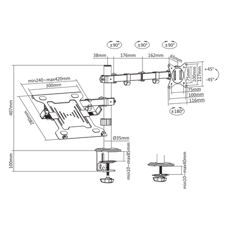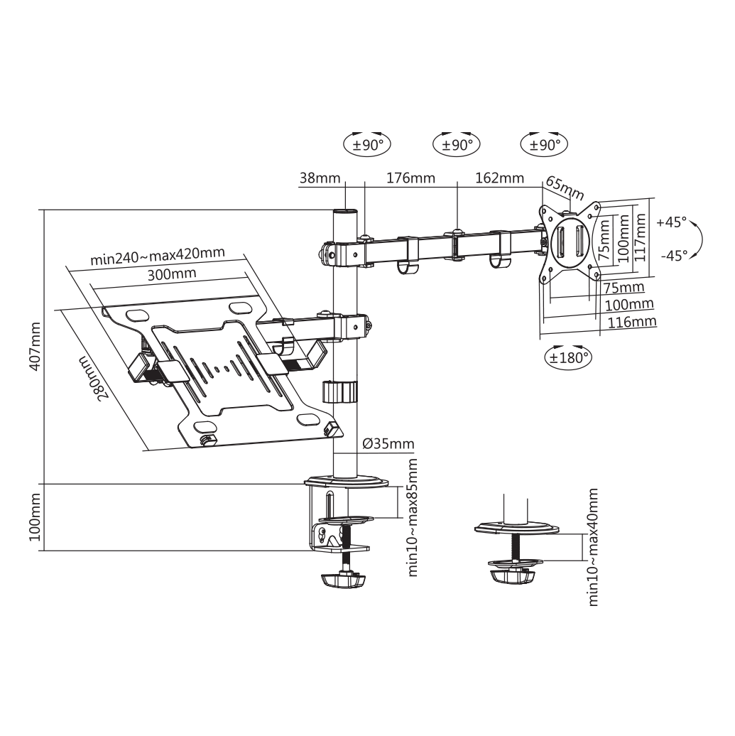 - Διαθέτει δυνατότητες κατακόρυφης κλίσης από +45° έως -45°, λειτουργικότητα περιστροφής από +90° έως -90° και περιστροφή οθόνης από +180° έως -180°.