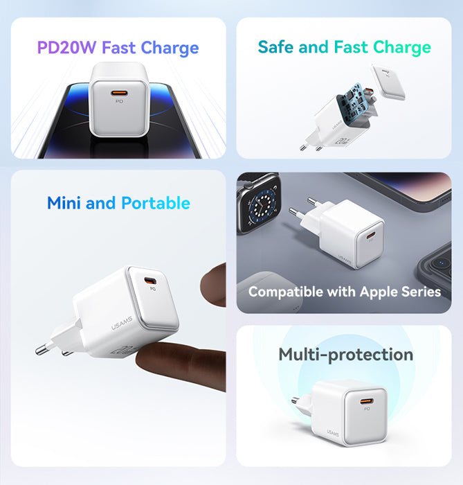 Υψηλής απόδοσης φορτιστής τοίχου της Usams, κατασκευασμένος από ανθεκτικό υλικό και συμβατός με συσκευές που φορτίζουν μέσω θύρας USB-C.